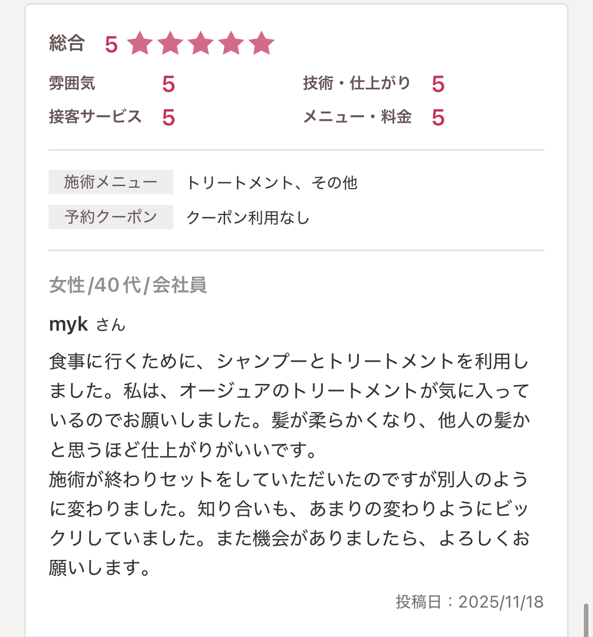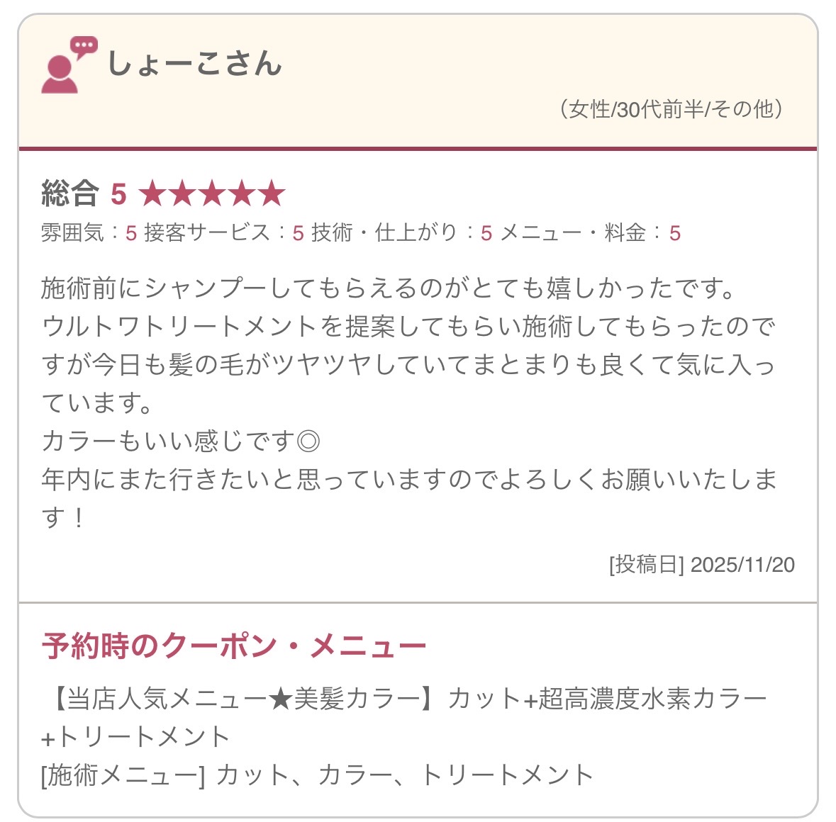 縮毛矯正やプレミアムシャイン、トリートメントメニューをされた方の実際の口コミです!