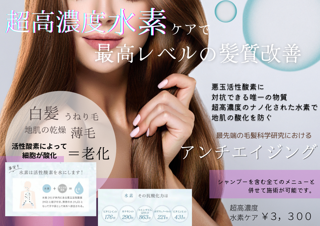 当店で行う超高濃度水素ケアは、薬剤施術で発生する活性酸素を除去しながらの施術により、カラーや縮毛矯正での老化ダメージを最小限に☺︎