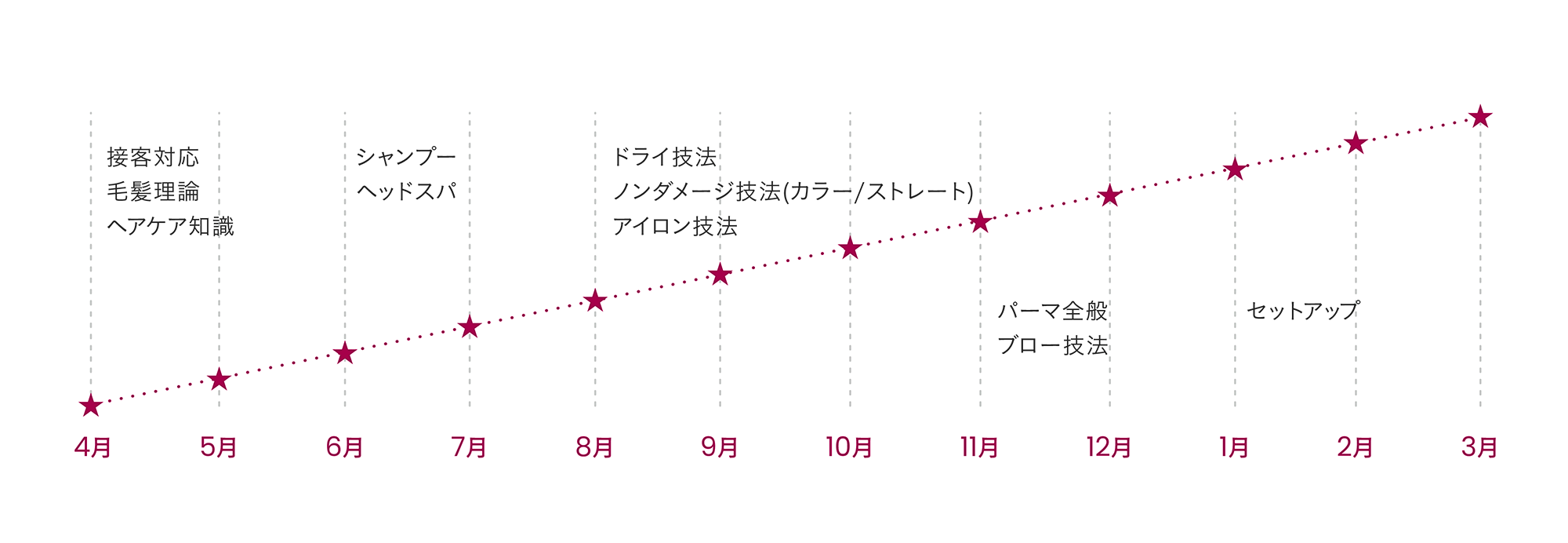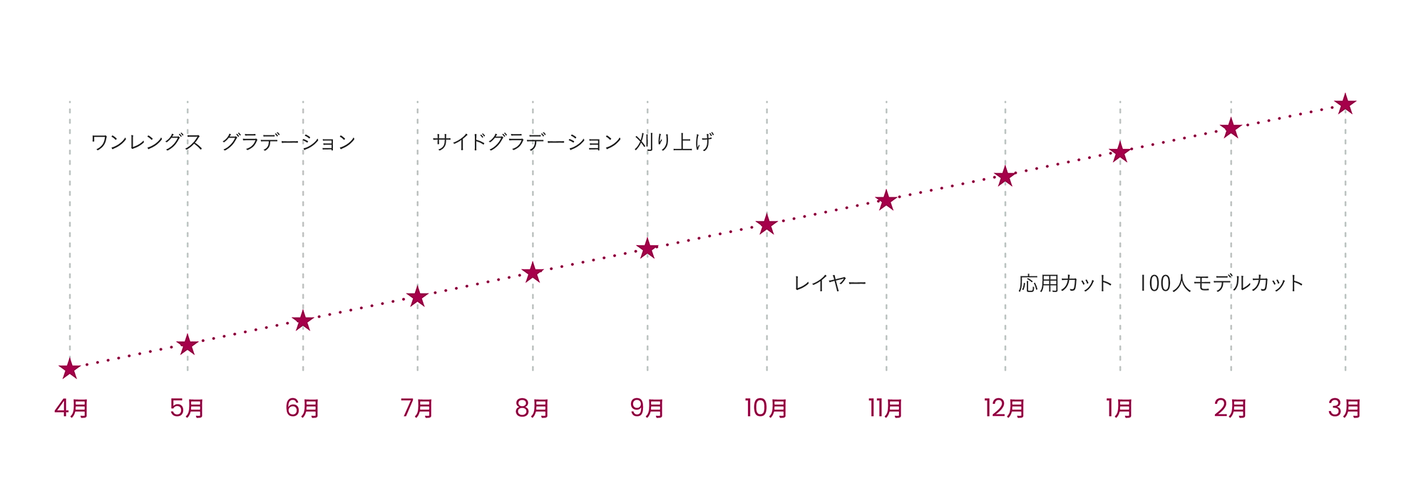 10年後、20年後、第一線で活躍できるように、 まずは基礎をしっかりと身につけてもらいます。 最短1年11ヶ月でスタイリストデビューを目指すことができます!